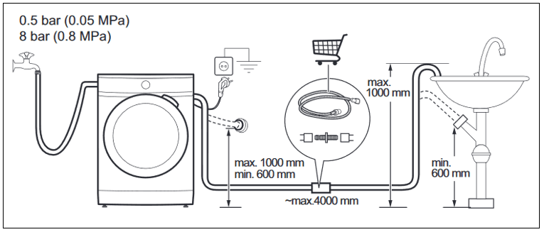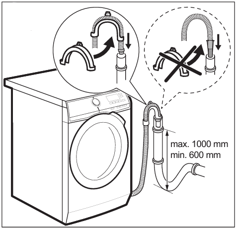 Высота слива должна быть не более 100 см и не менее 60 см над основанием машины, или как показано в руководстве пользователя. См. инструкции по установке в руководстве пользователя или отдельную инструкцию по установке, поставляемую в комплекте с прибором. Руководство пользователя можно скачать здесь.