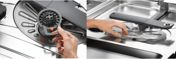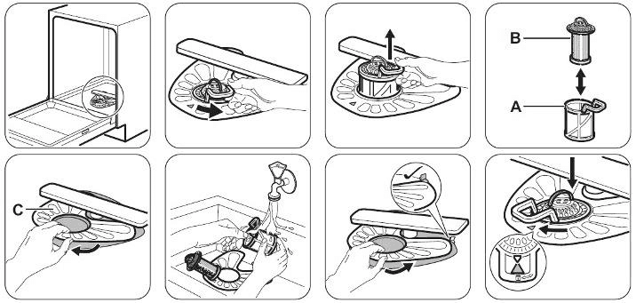 - Спробуйте очистити фільтри посудомийної машини (також великий фільтр навколо фільтра посередині) і переконайтеся, що на його дні та навколо нього немає їжі чи сміття. Потім знову спробуйте запустити цикл.