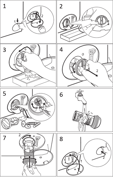 Очистіть насос та фільтр для пуху, включаючи лопаті насоса (якщо лопаті насоса видно, обертайте їх олівцем та знову встановіть фільтр).