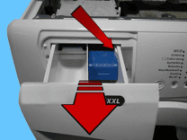 Вийміть ящик для миючого засобу, одночасно натискаючи на боки, щоб витягнути його (інакше різко потягніть).