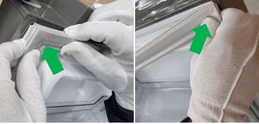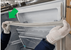 Переконайтеся, що лапка прокладки (у формі гачка) повністю втиснута в гніздо прокладки (паз вкладиша дверей).