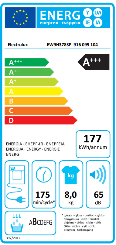 Этикетка ниже относится к модели осушителя с тепловым насосом . Прибор имеет класс энергопотребления A+++ , а время сушки для тестовой программы составляет 175 минут. Годовое потребление энергии этой модели осушителя с тепловым насосом составляет 177 кВтч/год.