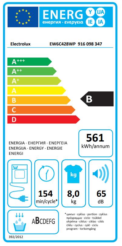 Этикетка ниже относится к модели осушителя конденсатора . Прибор относится к классу энергопотребления B , а время сушки для тестовой программы составляет 154 минуты. Годовое потребление энергии этой модели сушилки без теплового насоса составляет 561 кВтч/год.