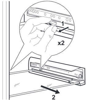 2. Вытяните стопорные штифты с обеих сторон полки (1).